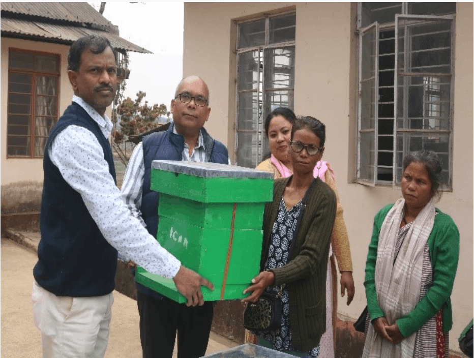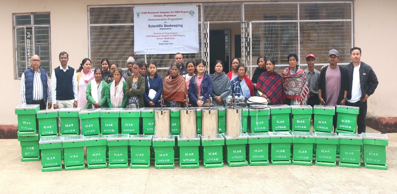 A one day training cum demonstration programme on “Scientific Beekeeping for the Tribal Farmers of Meghalaya” was organized by the Division of Crop Science on 11th March, 2025, at ICAR Research Complex for NEH Region, Umiam, Meghalaya under Tribal Sub Plan (TSP). A total of 22 participants from two different villages (Umramblei and Byrwa) under RiBhoi district of Meghalaya participated in the programme. Dr. Sandip Patra, Senior Scientist (Agricultural Entomology), Division of Crop Science, gave the welcome address and highlighted the importance of scientific beekeeping. Dr. Rumki Ch. Sangma, delivered lecture on species of honey bees, pests and diseases of honey bees and floral sources in Meghalaya for honey bees. Dr. Khrieketou Kuotsu demonstrated on the types of scientific bee box, management of scientific beekeeping, equipments and use of its accessories. An interaction among scientists and beekeepers was also held, where the queries of the beekeepers were answered by the scientists. Dr. Pankaj Baiswar, Head, Division of Crop Science highlighted the importance of scientific beekeeping for livelihood improvement and encouraged the beekeepers to become entrepreneurs on beekeeping and honey business. The scientific beekeeping tools (modern bee hive-44 no., excluder sheet-44 no., bee veil-22 no., hand glove-22 no., knife-22 no., smoker-22 no., and extractor-4 no.) were also distributed to the participants. The programme was coordinated by Dr. Sandip Patra, Dr. Rumki H. Ch. Sangma, Dr. Hammylliende Talang and Dr. Pankaj Baiswar of ICAR Research Complex for NEH Region, Umiam, Meghalaya. The coordinators are grateful to Dr. S. Hazarika, PS and Nodal officer, TSP, for funding the programme and also to the technical, YP and contractual staff of Entomology, DCS, for assisting the programme.